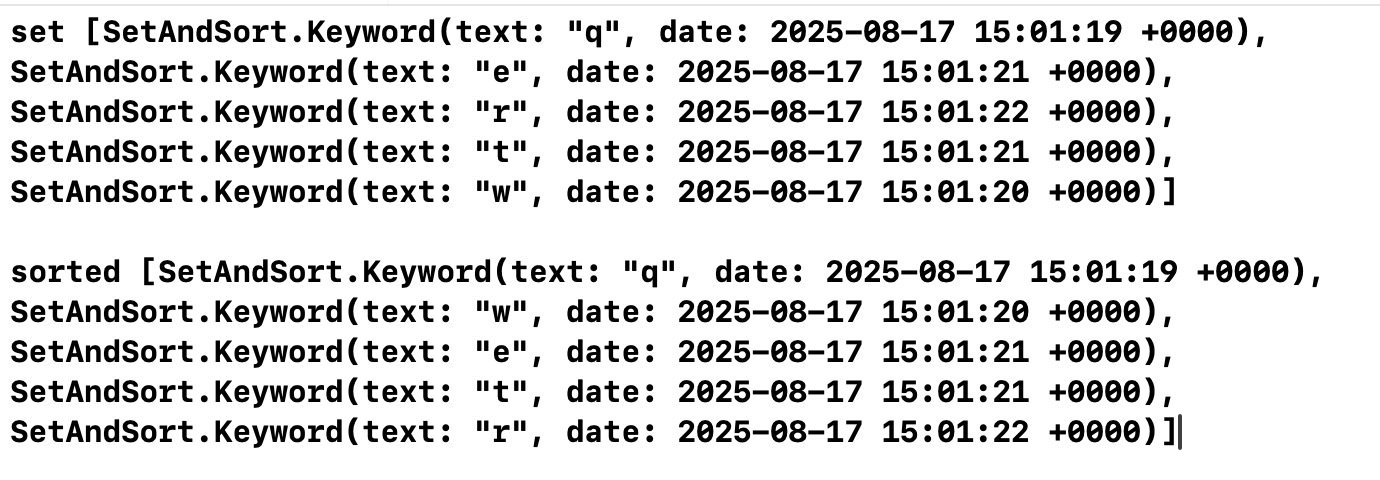 Keyword의 해시 밸류를 text만 기준으로 하여 시간에 상관없이 text로 중복을 제거할 수 있고, 비교 연산에선 date를 기준으로 하여 시간에 따른 정렬을 지원하게 한다.