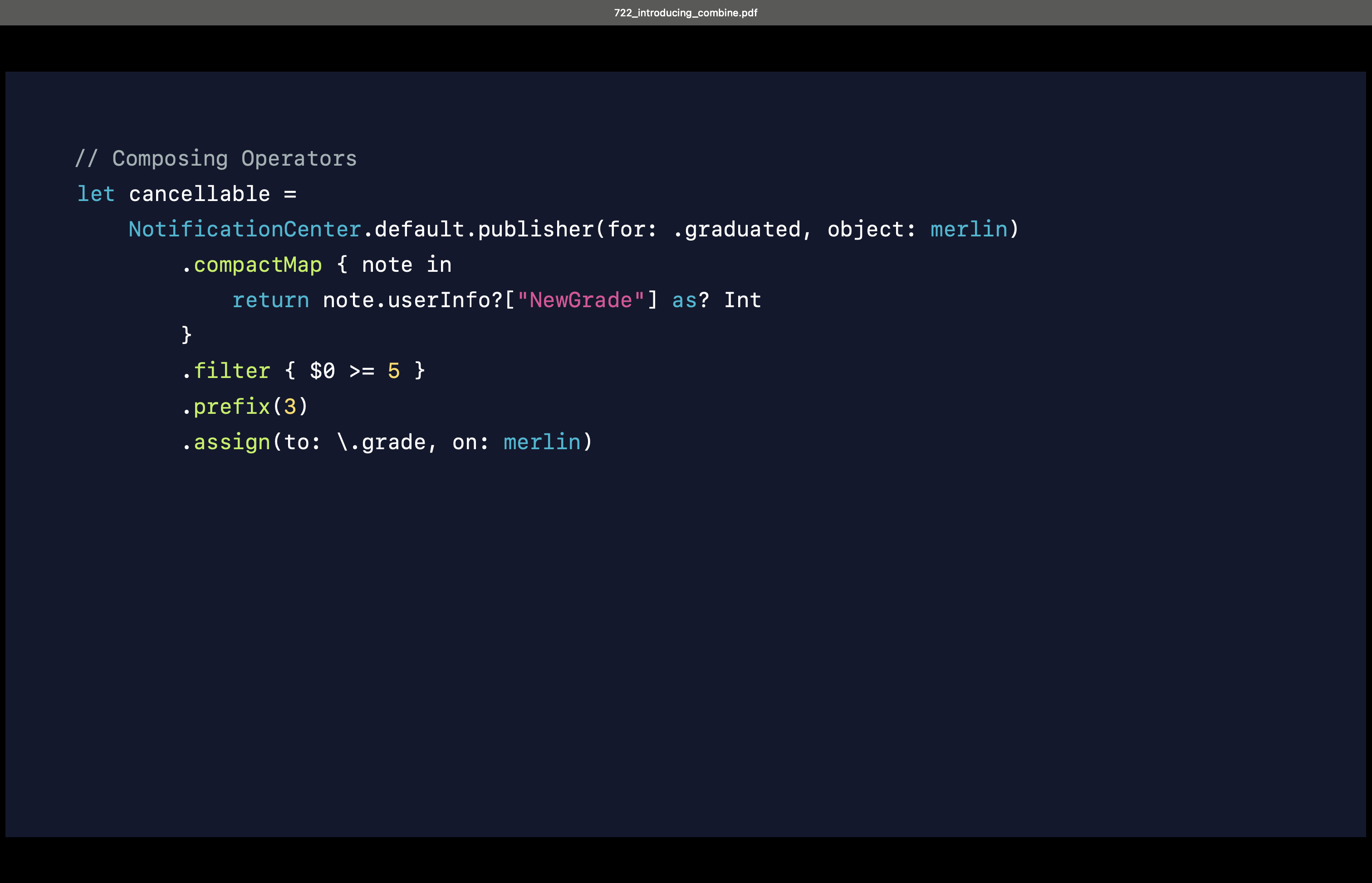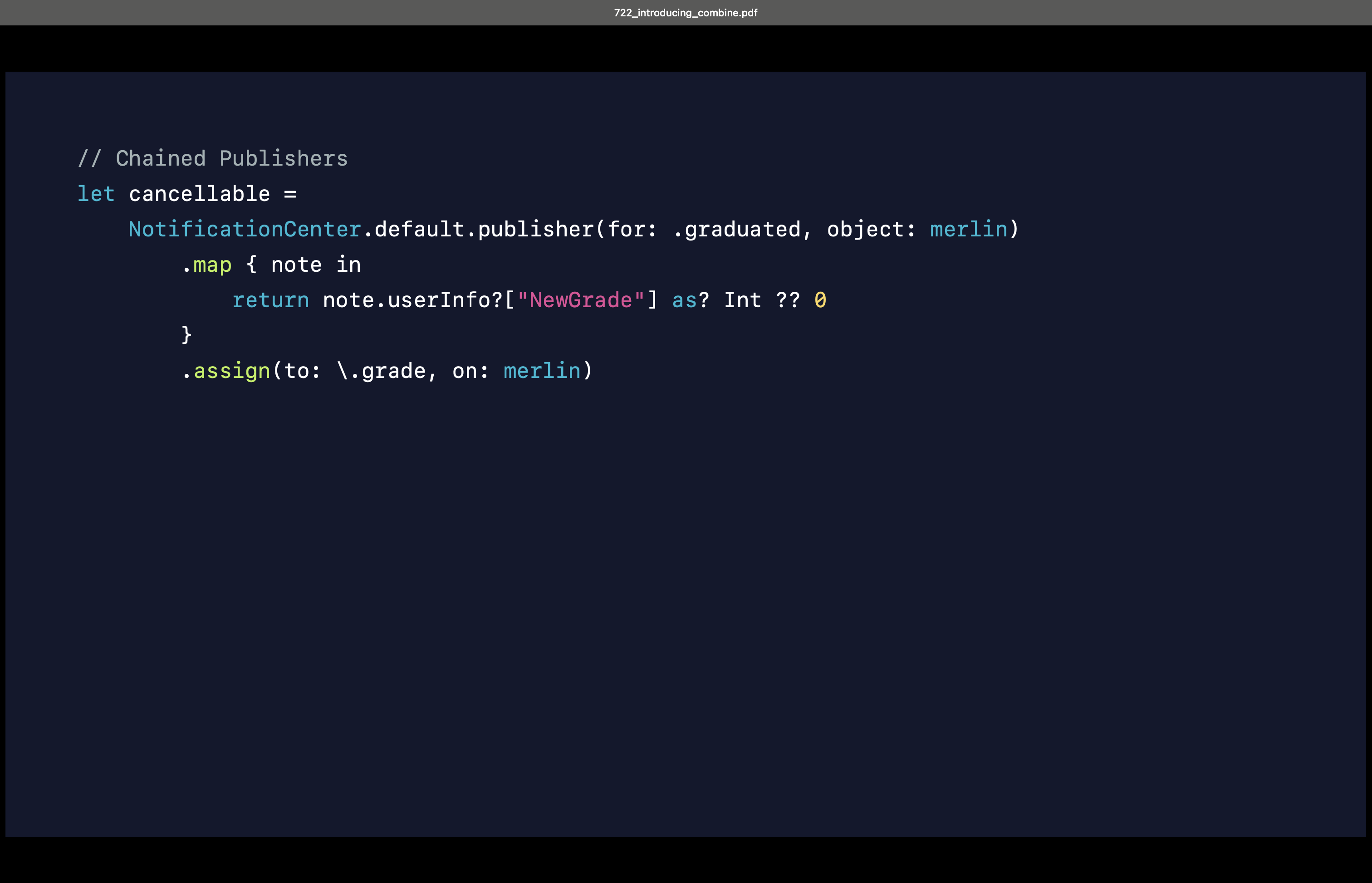 예제를 새로운 구문으로 사용하면, NotificationCenter 퍼블리셔에서 Merlin의 graduated 속성을 구독한다.
