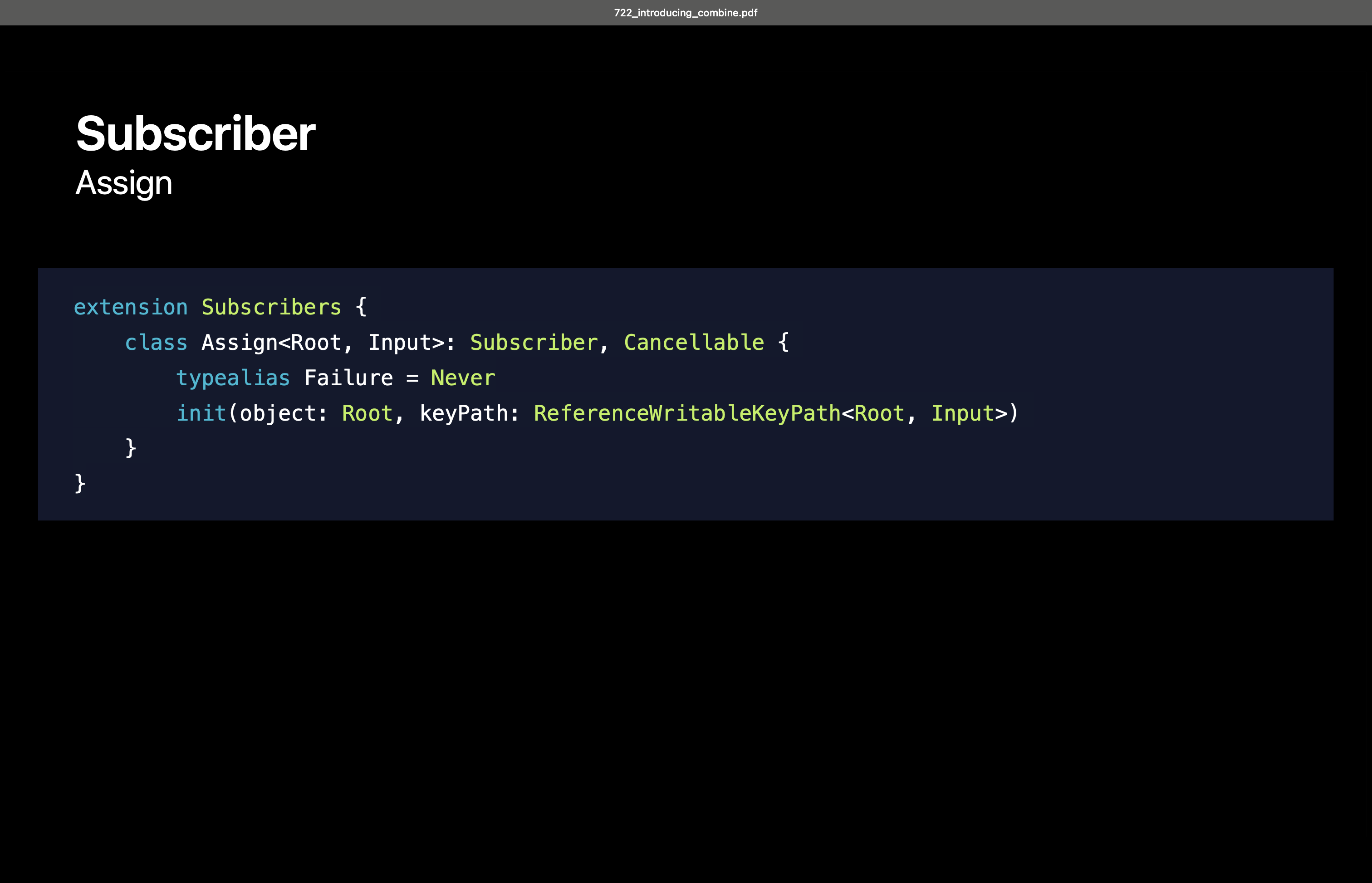 Assign은 클래스이며 클래스 혹은 객체의 인스턴스와 그에 대한 KeyPath를 입력으로 초기화된다.