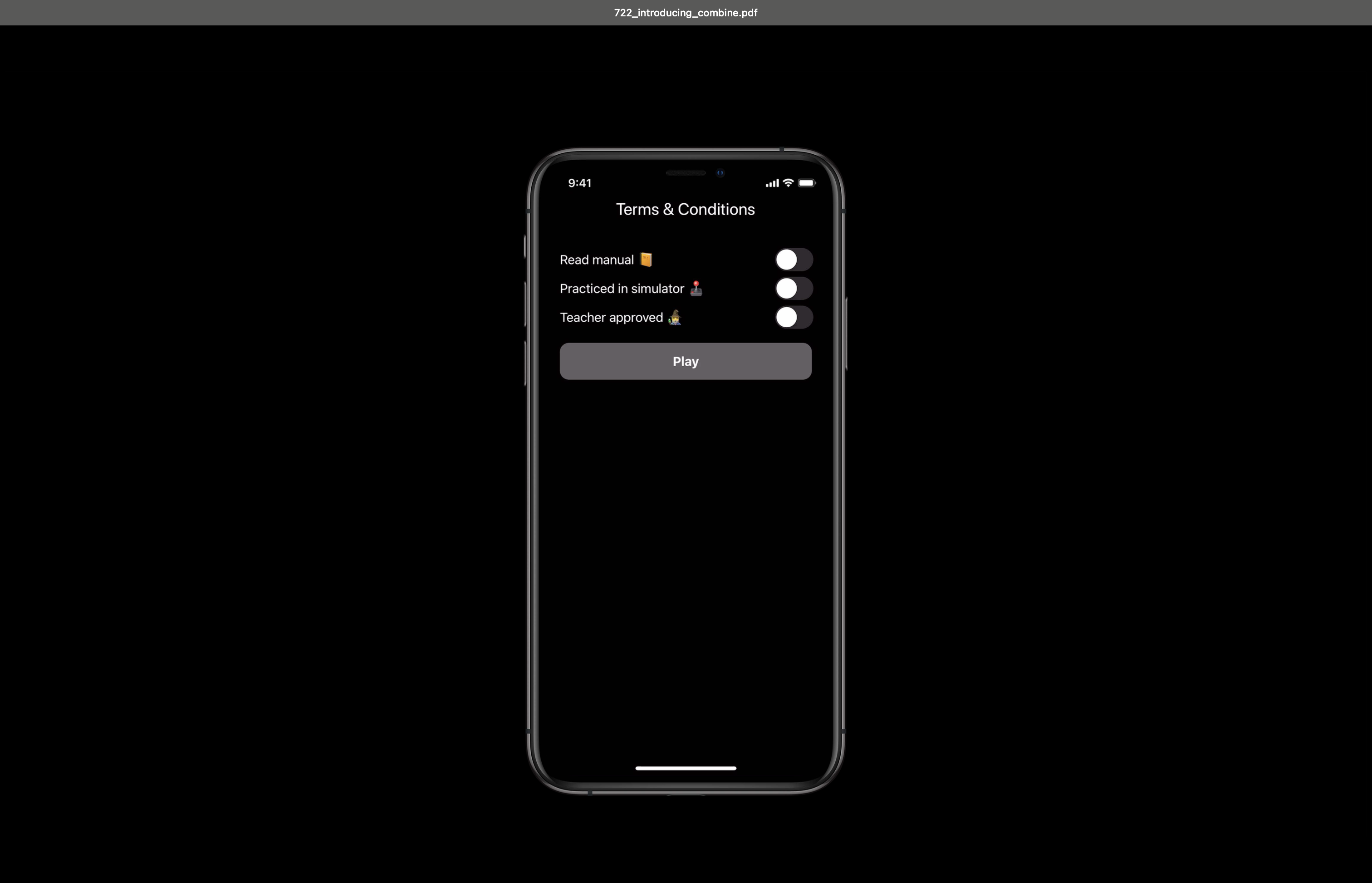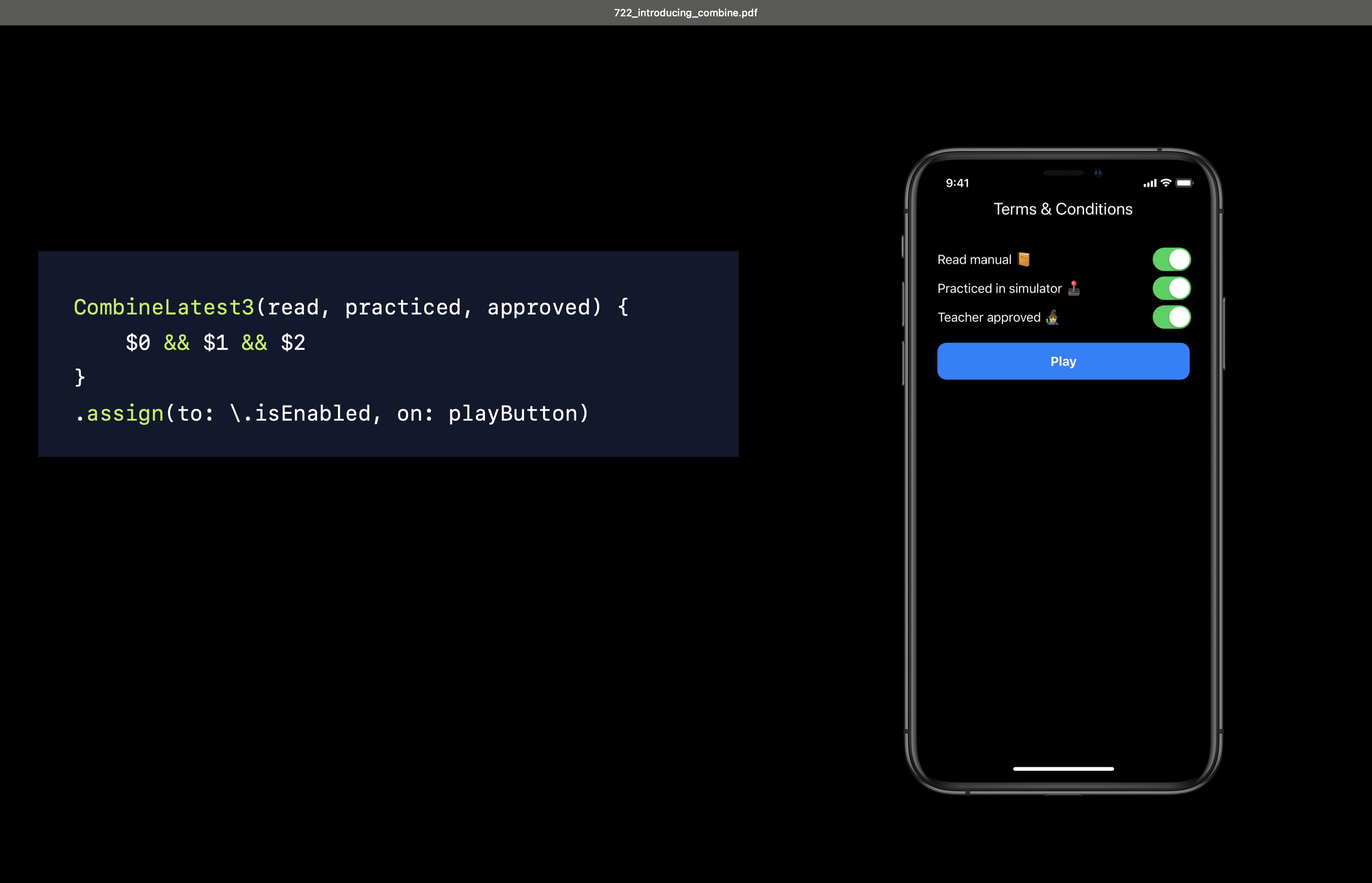 마법사 학교 앱에선 세 개의 업스트림으로 스위치 모두의 Bool 상태를 변경하고, 다시 단일 Bool 값으로 변환해 Play 버튼의 isEnabled 속성을 쓰도록 한다.