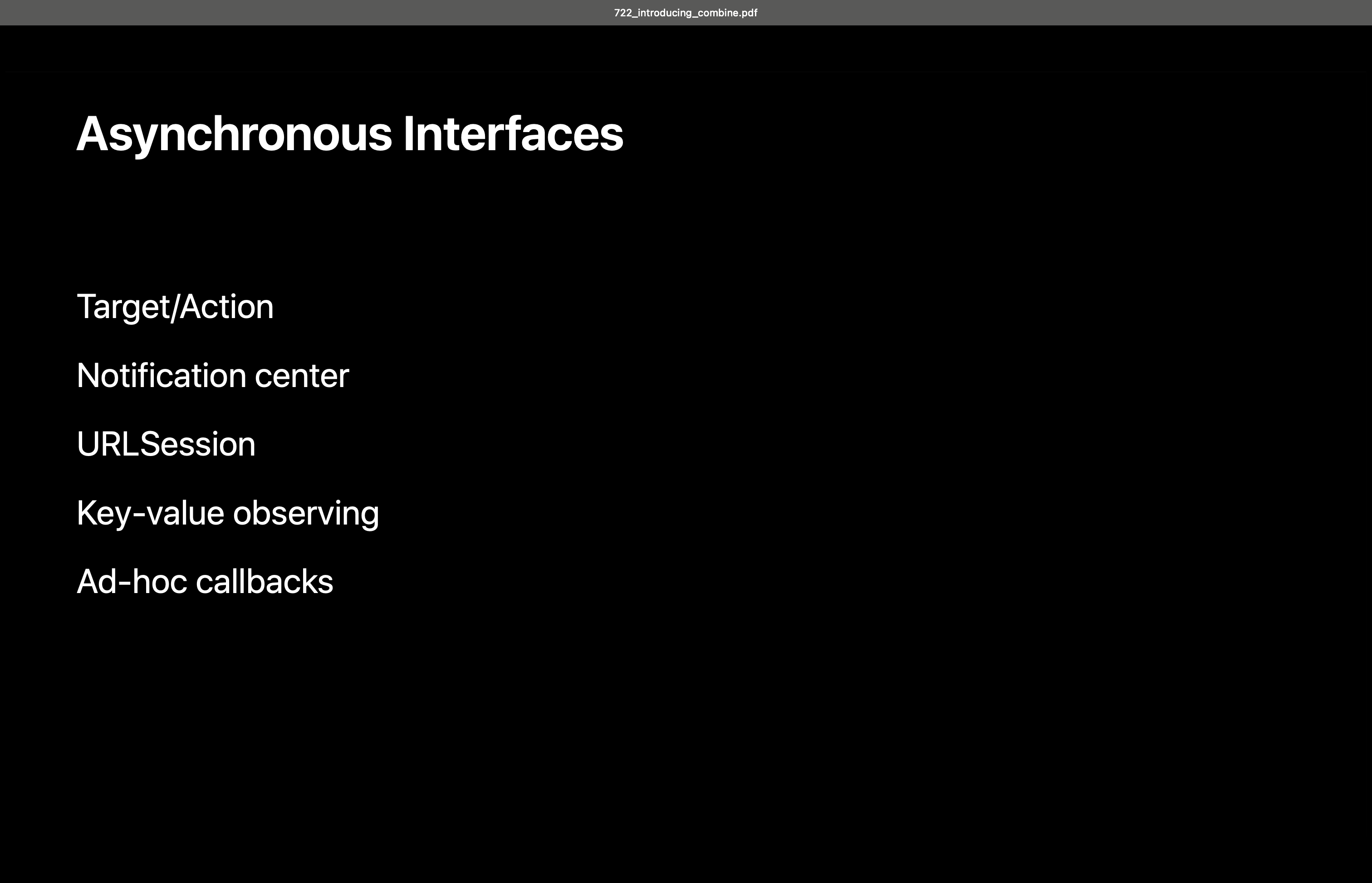 Cocoa SDK에는 Target/Action, NotificationCenter, 많은 ad-hoc 콜백을 포함해 다양한 것들이 있으며, 대부분 closure 혹은 completion 블록을 갖는 API이다.